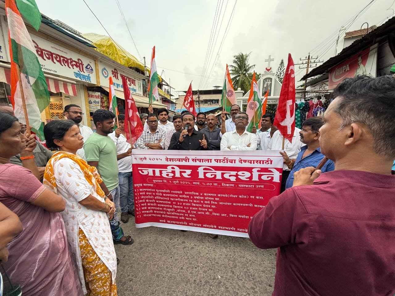 लागणार नाही. त्यामुळे प्रत्येक कामगाराला किमान वेतन ३० हजार रुपये हे मिळायलाच हवे,’’ असे आंतरराष्ट्रीय कामगार नेते आणि काँग्रेसचे रायगड जिल्हाध्यक्ष महेंद्रशेठ घरत उरण येथे कामगारांना मार्गदर्शन करताना म्हणाले. देशव्यापी संपाच्या पार्श्वभूमीवर उरणमध्ये बुधवारी (ता.९) कामगारांनी मोर्चा काढाला होता. त्यावेळी केंद्र सरकारचा कामगारांनी निषेध केला.९ जुलैचा देशव्यापी संपात साधारण २५ कोटी जनता रस्त्यावर आलीय, वीज कामगारांनी कडकडीत बंद पाळला आहे, परंतु त्यांनी सर्वसामान्य नागरिकांची गैरसोय होईल, अशी भूमिका घेतली नाही. केंद्र सरकारची एकंदरीत धोरणे पाहाता कामगार वर्ग शिल्लक राहील का, असा प्रश्न निर्माण होत आहे,’’ असे कॉ.भूषण पाटील यावेळी म्हणाले.यावेळी महेंद्रशेठ घरत यांच्या नेतृत्वाखाली न्यू मॅरिटाईम अण्ड जनरल कामगार संघटनेचे कामगार मोठ्या संख्येने रस्त्यावर आले होते. कामगार नेते रवी घरत, रमेश ठाकूर, वैभव पाटील, किरीट पाटील मान्यवर आण शेकडो कामगार उपस्थित होते.