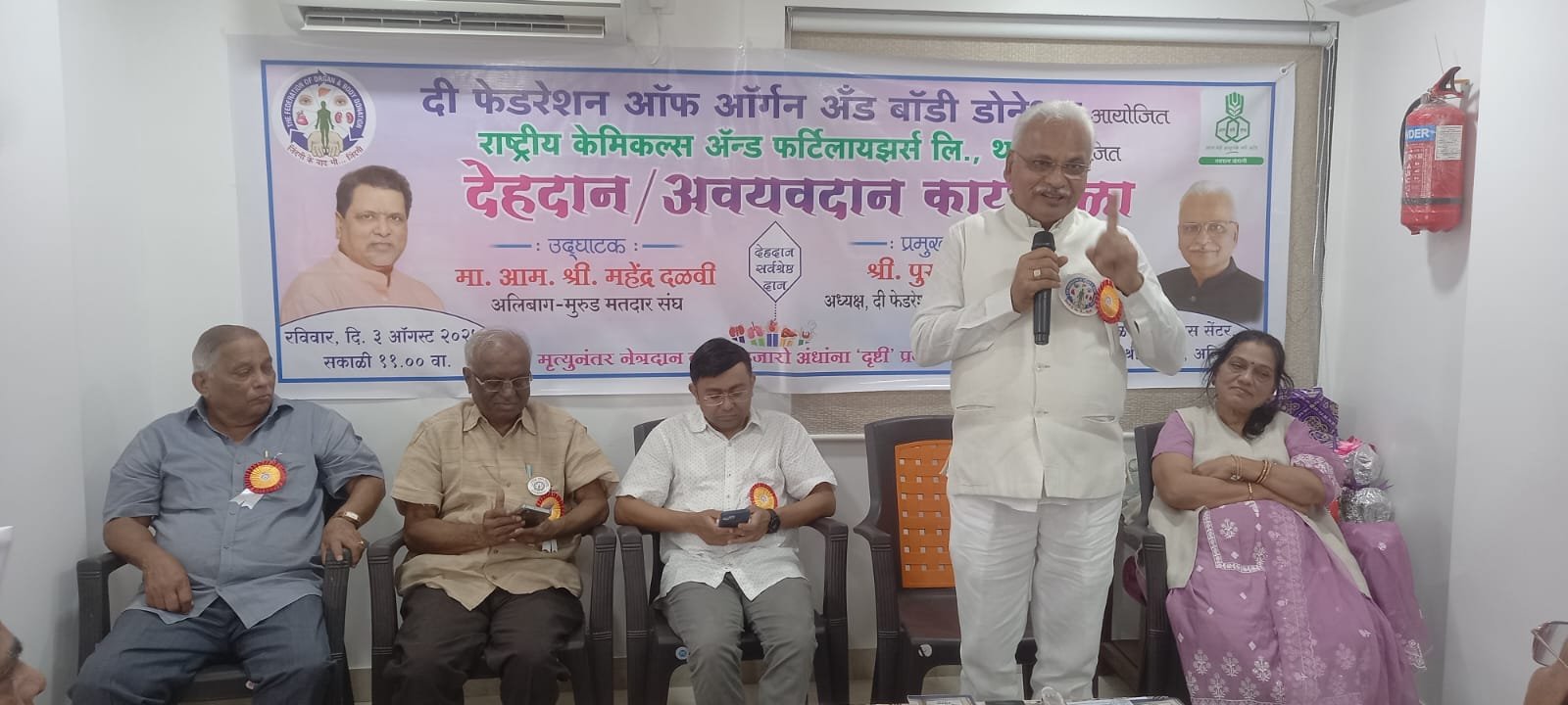 रायगड (अलिबाग) :- देहदानामुळे आपण अनेकांना जीवदान देऊशकतो हे सर्वसामान्यांना माहीत नाही. देहदान तसेच अवयवदान याबाबत लोकांमध्ये गैरसमज आहेत. ते दूर केले पाहिजेत. लोकांची मानसिकता बदलली पाहिजे, असे मत फेडरेशन ऑफ ऑर्गन अँड बॉडी डोनेशनचे संस्थापक अध्यक्ष पुरुषोत्तम पवार यांनी व्यक्त केले. राष्ट्रीय अवयवदान दिनानिमित्त रविवारी ( दि. ३) फेडरेशन ऑफ ऑर्गन अँड बॉडी डोनेशन यांच्यातर्फे राष्ट्रीय केमिकल्स ॲन्ड फर्टिलेझर्स (आरसीएफ) थळ यांच्या सहकार्याने कमळ डायलिसिस सेंटर अलिबाग येथे देहादनाबाबत कार्यशाळा आयोजित करण्यात आली होती. या कार्यक्रमात देहदान व अवयवदान याबाबत मार्गदर्शन करताना पुरुषोत्तम पवार बोलत होते. फेडरेशनच्या कार्यकारी समिती सदस्या डॉ. शुभदा कुडतरकर यांनी नेत्रदानाबाबत माहिती दिली.दी फेडरेशन ऑफ ऑर्गन अँड बॉडी डोनेशनचे मुख्य समन्वयक कुमार कदम , कमळ सेवा संस्थेचे संचालक या कार्यशाळेचे निमंत्रक गिरीश तुळपुळे, आरसीएफ थळचे जनसंपर्क अधिकारी डॉ. राकेश कवळे, माजी जिल्हा सरकारी वकील एड. प्रसाद पाटील, माणुसकी प्रतिष्ठानचे डॉ. राजाराम हुललवान, रोटरी क्लबचे अध्यक्ष अंकुश पाटील , रोटरी क्लबचे माजी अध्यक्ष दिलीप भाड, दिलीप जोग, संजीवनी नाईक, डॉ. नितीन गांधी, अनिल आगाशे, केतन शहा, श्रीनिवास पाटील, प्रवीण जैन , संदीप मोने आदी मान्यवर यावेळी उपस्थित होते. महादानाची गाथा या पुस्तिकेचे प्रकाशन डॉ. राकेश कवळे यांच्या हस्ते यावेळी करण्यात आले. कुमार कदम यांनी प्रास्ताविक केले. गिरीश तुळपुळे यांनी आभारप्रदर्शन केले.