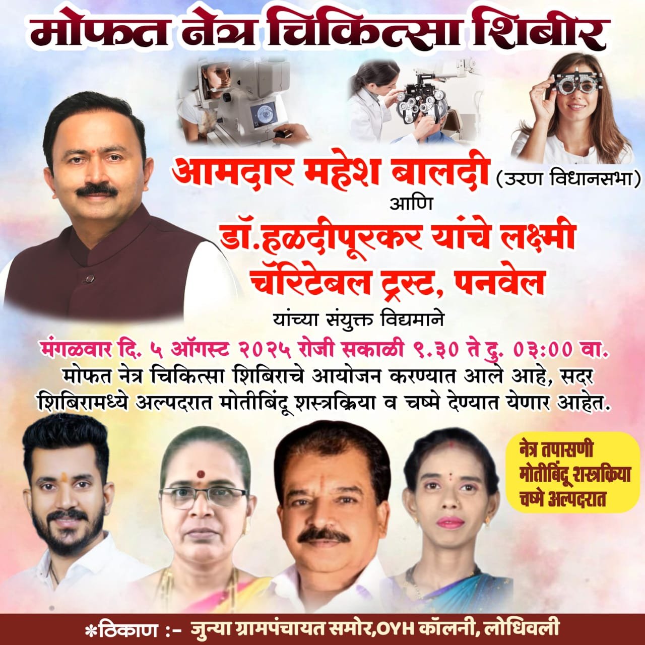 ग्रामपंचायत व आयोजकांनी केले आहे. शिबिराचे तपशीलः दिनांक: ०५/०८/२०२५ (मंगळवार)वेळ: सकाळी ९.३० ते दुपारी ३.०० स्थळ: जुन्या ग्रामपंचायत कार्यालयासमोर, लोधिवली, ता. खालापुर, जि. रायगड विशेष सूचना:मोतीबिंदू शस्त्रक्रियेसाठी रुग्णांना पनवेल येथे ने-आण करण्याची सोय करण्यात आली आहे.इच्छुक रुग्णांनी रेशन कार्ड, आधार कार्डाची झेरॉक्स, मोबाईल क्रमांक आणि चालू औषधांची माहिती सोबत आणावी.डोळ्यांचे सर्व आजार व समस्यांवर शिबिरात उपचार करण्यात येणार आहेत.संपर्क:श्री. विनोद पाचघरे: ९५९४९८६८१८ श्री. निखिल पाटील (ग्रा.पं. सदस्य): ७०८३१३११०० श्री. सुभाष शिदे (ग्रा.पं. सदस्य): ९९७००६२०५६ शिबिराचे आयोजन करताना लोधिवली ग्रामपंचायतचे सर्व पदाधिकारी, सरपंच, उपसरपंच, सदस्य, पोलिस पाटील, आशा वर्कर्स, अंगणवाडी सेविका तसेच ग्रामस्थ मंडळ यांनी उपस्थित राहून सहकार्य करण्याचे आवाहन करण्यात आले आहे.