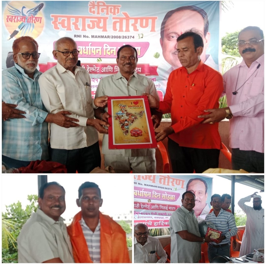 रायगड :- दैनिक स्वराज्य तोरणचा १७ वा वर्धापन दिन सोहळा संपादक डॉ. श्री. किशोर बळीराम पाटील यांच्या अध्यक्षतेखाली कैलासनगर, वळपाडा येथे मोठ्या उत्साहात साजरा करण्यात आला.या कार्यक्रमाला ज्येष्ठ पत्रकार अरुण मिश्रा, फकरे आलम, आचार्य सुरजपाल यादव ,संतोष चव्हाण,डॉ.श्री.मनीलाल रतिलाल शिंपी, आसद काजमी,अब्बू बकार, राजेंद्र काबाडी, अशोक, पाटोळे, कुसुमताई देशमुख, नीलम तिवारी ,परविन खान, मंजू गुप्ता, रेश्मा अन्सारी, सोमनाथ बाळाराम ठाकरे, अफसर खान, व विविध माध्यमांतील पत्रकार बांधव मोठ्या संख्येने उपस्थित होते.जवळजवळ ६५ पत्रकारांना हेल्मेट व मिठाईचे वाटप करण्यात आले.या प्रसंगी स्वराज्य तोरणच्या १७ वर्षांच्या यशस्वी वाटचालीचा आढावा घेण्यात आला. दैनिक स्वराज तोरणने गेल्या १७ वर्षात