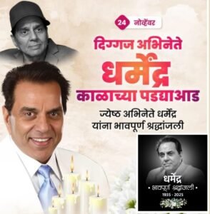 मुंबई :- भारतीय चित्रपट सृष्टीचे महानायक, सर्वांच्या ह्रदयावर अधिराज्य गाजवणारे हिंदी चित्रपट सृष्टीच्या बाॅलिवुड मधील अभिनेते सुपरस्टार धर्मेंद्र यांच्या निधनामुळे एक सुवर्णयुग संपले आहे. त्यांच्या अभिनयाने , साधेपणाने व प्रेमळ स्वभावाने त्यांनी कोट्यावधी चाहत्यांच्या मनावर कायम राज्य केले. आज ते आपल्यात नसले तरी त्यांचे अभिनय कार्य, त्यांचा आवाज, त्यांचे हास्य सदैव प्रेरणा देत राहील. हिंदी चित्रपट सृष्टीला आपल्या अभिनयाने तब्बल साडे सहा दशके समृध्द करणारे धर्मेंद्र हे ही मॅन ( He man ) प्रतिमेमुळे चाहत्यांच्या गळ्यातील ताईत बनले होते.
