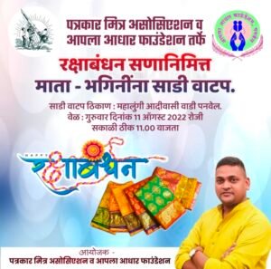 प्रमाणात रक्षाबंधन साजरा होत असतो व भाऊ बहीण एकमेकांना मोठे व महागडे गिफ्ट्स देखील देत असतात मात्र याची जाणीव ठेवूनच पत्रकार मित्र असोसिएशन व आपला आधार फाउंडेशनचे संस्थापक अध्यक्ष केवल महाडिक यांच्या संकल्पनेतून आपला आधार फाउंडेशन व पत्रकार मित्र असोसिएशनच्या वतीने रक्षाबंधन सणानिमित्त पनवेल तालुक्यातील महालुंगी आदिवासी वाडी येथील माता भगिनींना साडी वाटप करण्यात येणार आहे. गुरुवार दिनांक ११ ऑगस्ट २०२२ रोजी सकाळी ठीक ११.०० वाजता महालुंगी आदिवासी वाडी येथे या कार्यक्रमाचे आयोजन करण्यात आले आहे.
