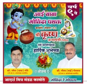 याप्रसंगी शेतकरी कामगार पक्षाचे नेते कामोठे कार्याध्यक्ष गौरव पोरवाल यांनी आदर्श मंडळाच्या गोविंद पथकांना सदिच्छा भेट देऊन भगवान श्रीकृष्णाच्या चरणी प्रार्थना केली की दरवर्षीप्रमाणे यावर्षीही तुझ्या आठवणीतून जे गोविंदा आपल्या आस्था,परंपरेने गोकुळाष्टमी दहीहंडी उत्सव साजरा करतील त्या सर्वांना सुखरूप ठेवून तुझा आशिर्वाद आम्हा सर्वांवर सदैव असाच राहू दे असे गौरवोद्गार पोरवाल यांनी काढले तसेच गोविंदा पथकांसाठी देवाकडे प्रार्थना ही केली व मनापासून सर्वांना दहीहंडीच्या शुभेच्छा दिल्या.