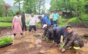 रत्नागिरी (खेड) :- या हळद लागवडीच्या प्रकल्पांतर्गत प्रात्यक्षिकातून प्रशिक्षण.. हा उपक्रम अर्थात हळद रोपे लागवडीचे प्रात्यक्षिक मौजे खवटी ता खेड येथील शेतकरी श्री सुरेश राजाराम शिंदे , मनोहर पांडुरंग दळवी, सुभाष दळवी, अनंत दळवी, कृष्णा मांडवकर यांच्या शेतावर आज दि.३०/०६/२०२३ रोजी सकाळी ११.०० वा. आयोजित करण्यात आला. यावेळी पं. स. खेड चे गट विकास अधिकारी मा. श्री भांड साहेब, ,SK-4 चे प्रणेते श्री. सचिन कारेकर तसेच SK-4 चे स्टार मार्गदर्शक श्री. गजेंद्रजी पौनीकर , राजकुमार धायगुडे कृषी विस्तार अधिकारी, पंचायत समिती गुहागर, सहा प्रशासन अधिकारी श्री ईचुर साहेब, सरपंच श्री शैलेश दळवी, विस्तार अधिकारी श्री दिनेश राणे, सुनिल गावडे,मुरलीधर कुराई, विघ्नेश खांडके, ग्रामसेवक रमेश घोडके इ उपस्थित होते यावेळी उमेद च्या वारनकर मॅडम, बचत गटातील महिला उपस्थित होत्या