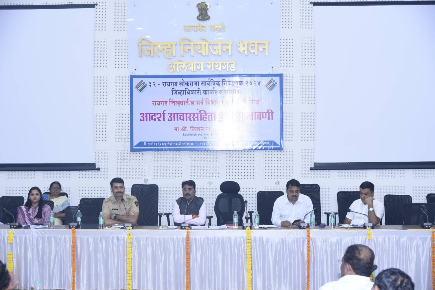 जिल्हाधिकारी श्री जावळे म्हणाले,रायगड मतदार संघासाठी तिसऱ्या टप्प्यात म्हणजे ७ मे रोजी मतदान होणार आहे. जिल्ह्यात कालपासून लोकसभा निवडणूक आदर्श आचारसंहिता लागू झाली आहे. सर्व स्थानिक स्वराज्य संस्थांनी शासकीय- निमशासकीय कार्यालये, सार्वजनिक ठिकाणी लावण्यात आलेले भित्तीपत्रक, झेंडे, कटआऊट्स, संदेश काढून त्याचा अहवाल २४ तासात सादर करावा. भिंतीवरील रंगविलेल्या जाहिरातीदेखील काढण्यात याव्यात.