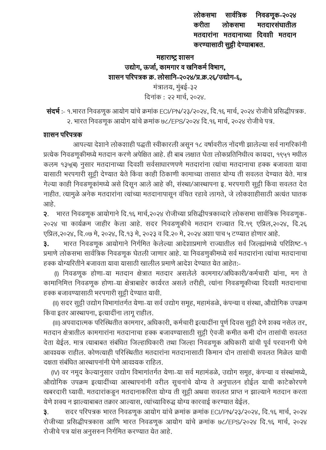सर्व मतदारांना त्यांचा मतदानाचा हक्क योग्यरितीने बजावता यावा, यासाठी परिपत्रक जारी करण्यात आले आहे.या आदेशानुसार निवडणूक होणाऱ्या मतदान क्षेत्रात मतदार असलेले कामगार, अधिकारी, कर्मचारी यांना मग ते कामानिमित्त निवडणूक होणाऱ्या क्षेत्राबाहेर कार्यरत असले तरीही, त्यांना निवडणुकीच्या दिवशी मतदानाचा हक्क बजावण्यासाठी भरपगारी सुट्टी देण्यात येणार आहे.ही सुट्टी उद्योग विभागांतर्गत येणाऱ्या सर्व उद्योग समूह, महामंडळे, कंपन्या व संस्था, औद्योगिक उपक्रम किंवा इतर आस्थापना आदींना लागू राहणार आहे.अपवादात्मक परिस्थितीत कामगार, अधिकारी, कर्मचाऱ्यांना पूर्ण दिवस सुट्टी देणे शक्य नसेल तर, मतदान क्षेत्रातील कामगारांना मतदानाचा हक्क बजावण्यासाठी सुट्टी ऐवजी कमीत कमी दोन तासांची सवलत दिली जाणार आहे. मात्र त्याबाबत संबंधित जिल्हाधिकारी तथा जिल्हा निवडणूक अधिकारी यांची परवानगी घेणे आवश्यक राहील.कोणत्याही परिस्थितीत मतदारांना मतदानासाठी किमान दोन तासांची सवलत मिळेल, याची दक्षता संबंधित आस्थापनांनी घेणे आवश्यक राहणार आहे. उद्योग विभागांतर्गत येणाऱ्या सर्व महामंडळे, उद्योग समूह, कंपन्या व संस्थांमध्ये, औद्योगिक उपक्रम इत्यादींच्या आस्थापनांना या सूचनांचे योग्य ते अनुपालन होईल, याची काटेकोरपणे खबरदारी घ्यावी लागणार आहे.मतदारांकडून मतदानाकरिता योग्य ती सुट्टी अथवा सवलत प्राप्त न झाल्याने मतदान करता येणे शक्य न झाल्याबाबत तक्रार आल्यास, त्यांच्याविरुद्ध योग्य कारवाई करण्यात येणार आहे, अशा सूचनाही या आदेशाद्वारे देण्यात आल्या आहेत.