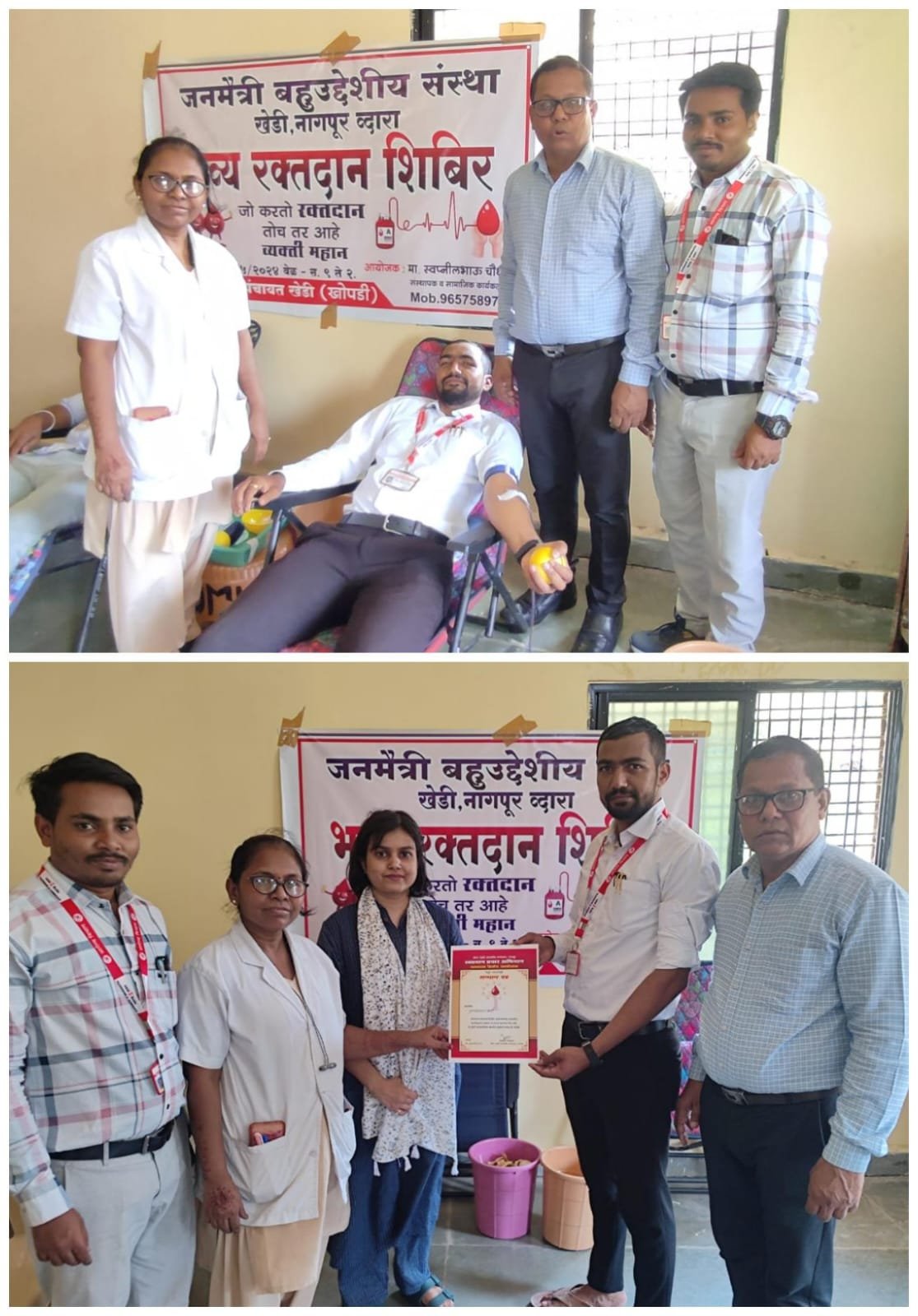 नागपुर (रामटेक) :- युवामित्र परिवार खेडी आणि जनमैत्री बहुद्देशीय संस्था खेडी यांचेद्वारे ग्रामपंचायत खेडी या ठिकाणी डागा स्मृती शासकीय स्त्री रुग्णालय, नागपूर येथील शासकीय रक्तपेढीच्या माध्यमातून भव्य रक्तदान शिबिराचे दिनांक १९ मे २०२४ रोज रविवारला सकाळी ९ ते २ वाजता पर्यत आयोजन करण्यात आले होते. त्यामध्ये खेडी गावातील एकूण २५ रक्तदात्यांनी रक्तदान केले. त्यामध्ये जनमैत्री संस्थाचे संस्थापक स्वप्नील चौधरी व श्रीकृष्णा काळे, शुभम गावंडे, विनोद इंगळे,