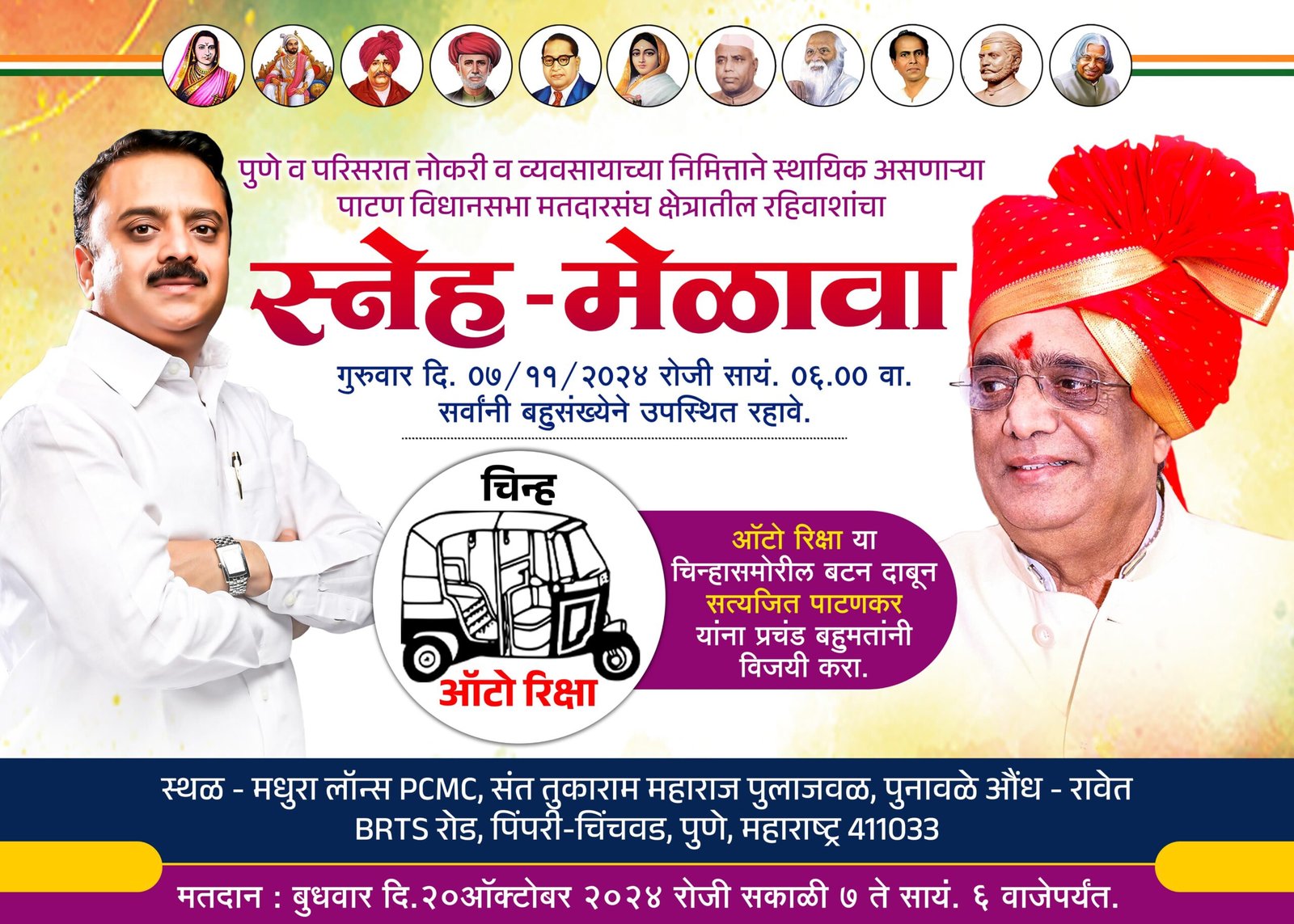 मेळाव्याच्या निमित्ताने सर्वांनी एकत्र येऊन आपल्या मतदारसंघातील नेते, सत्यजित पाटणकर यांना ऑटो रिक्षा चिन्हावर मतदान करून विजयी करण्यासाठी पाठिंबा व्यक्त करावा, असे आवाहन करण्यात आले आहे. यावेळी मतदारांना त्यांच्या प्रश्नांसाठी आणि समाजातील विकासासाठी एकत्र येण्याची संधी मिळणार आहे.मतदानाची माहिती: पाटण विधानसभा मतदारसंघासाठी मतदान बुधवार, २० ऑक्टोबर २०२४ रोजी सकाळी ७ ते सायंकाळी ६ वाजेपर्यंत होणारआहे.