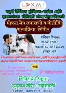 रायगड (पनवेल) :- लक्ष्मी चॅरिटेबल हॉस्पिटल-पनवेल आणि ग्रामस्थ मंडळ लोधिवली यांच्या संयुक्त विद्यमाने मोफत नेत्र तपासणी व मोतीबिंदू शस्त्रक्रिया शिबीर हनुमान मंदिर, लोधिवली येथे यशस्वीरित्या संपन्न झाले. शिबीर शनिवार, ४ जानेवारी २०२५ रोजी सकाळी १० ते दुपारी ३ वाजेपर्यंत पार पडले.शिबिरादरम्यान अनेक नागरिकांनी नेत्र तपासणी करून घेतली, तसेच मोतीबिंदू शस्त्रक्रियेसाठी निवड झालेल्यांची नोंदणी करण्यात आली.