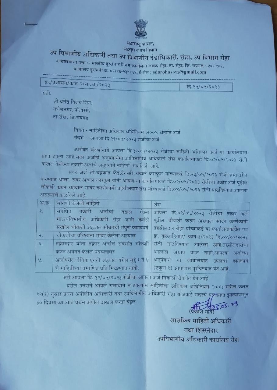 पत्रकार समीर बामुगडे रोहा जिल्हा रायगड.मा.श्री ज्ञानेश्वर खुटवड यांचे आदेश पत्राला रोहा तहसीलदार श्री देशमुख यांच्याकडून केराची टोपली, बाब माहिती...