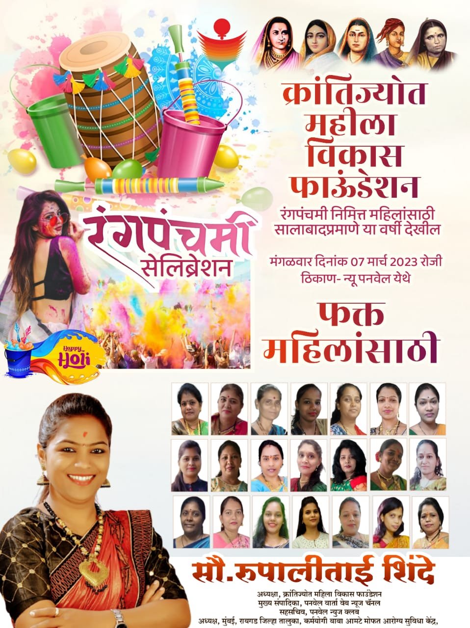 प्रतिनीधी पनवेल क्रांतिज्योत महिला विकास फॉउंडेशन तर्फे सालाबादप्रमाणे यंदाही रंगपंचमी सेलेब्रेशनचे आयोजन.. रायगड(पनवेल):- पनवेलमधील अन्यायग्रस्त,पीडित, बेरोजगार महिलांच्या मदतीला नेहमीच तत्पर...