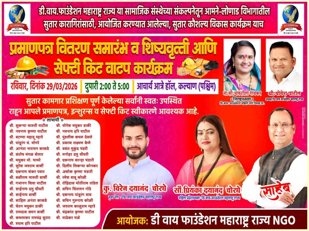 प्रतिनिधी ठाणे (कल्याण ) -डी .वाय. फाउंडेशन महाराष्ट्र राज्य या सामाजिक संस्थेचे संस्थापक अध्यक्ष श्री.दयानंद मोतीराम चोरघे यांच्या संकल्पनेतून आमने-लोणाड...