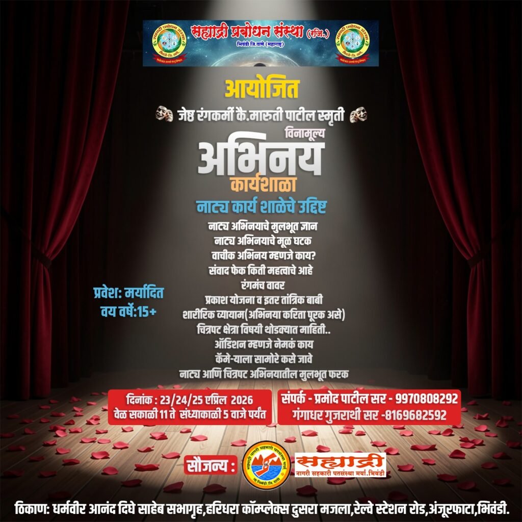 प्रतिनिधी ठाणे ( भिवंडी) :- (आ.मा.टॉ.टे.न्यू.) नाट्यकलेची आवड असलेल्या तरुणांसाठी एक आनंदाची बातमी आहे. सह्याद्री प्रबोधन संस्था भिवंडी यांच्या वतीने...