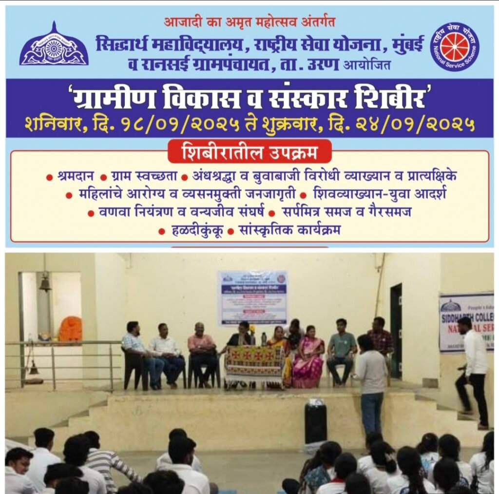 प्रतिनिधी मुंबई :- सिद्धार्थ वाणिज्य व अर्थशास्त्र महाविद्यालय मुंबई, राष्ट्रीय सेवा योजनेचे सात दिवसांचे, ग्रामीण विकास व संस्कार शिबीर, दि....