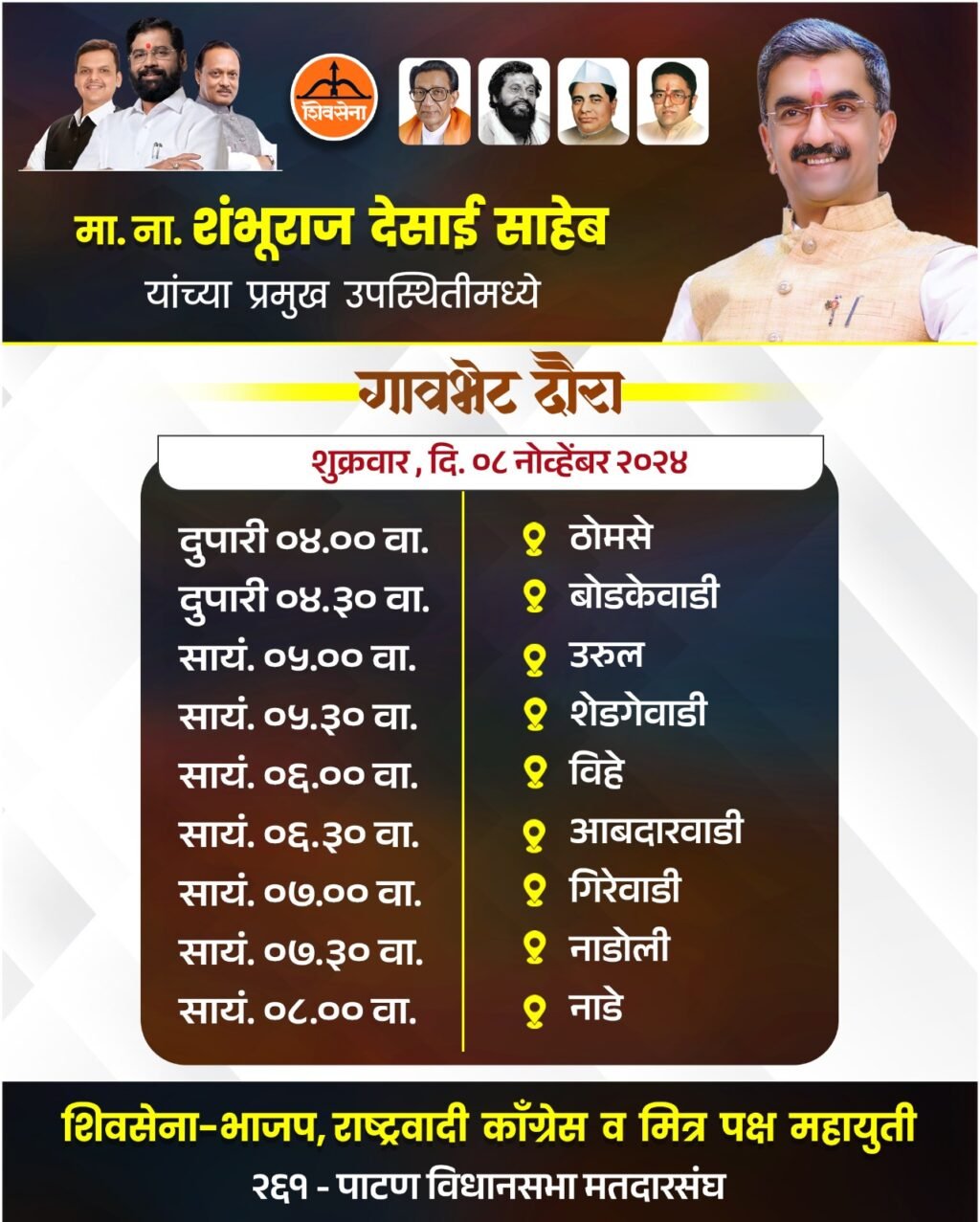 प्रतिनिधी शाशिकांत माथणे सातारा :- पाटण विधानसभा मतदारसंघातील विविध गावांमध्ये शुक्रवार, दिनांक ०८ नोव्हेंबर २०२४ रोजी, मा. ना. शंभूराज देसाई...