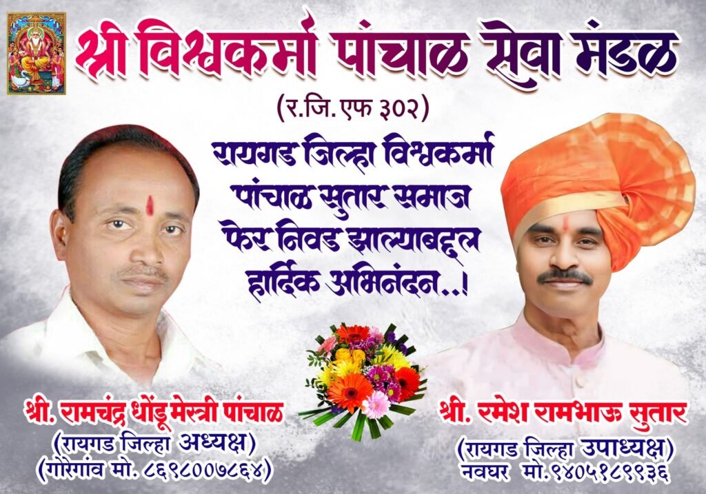 प्रतिनिधी पांडुरंग माने रायगड (गोरेगाव) :- श्री विश्वकर्मा पांचाळ सेवा मंडळ (र.जि. एफ ३०२)रायगड जिल्हा विश्वकर्मा पांचाळ सुतार समाज यांच्या...