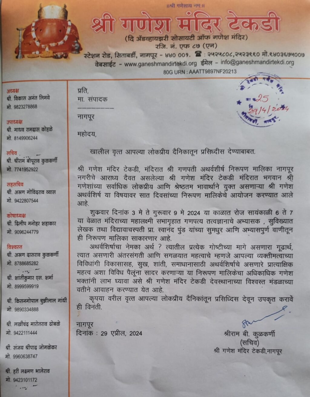 सचिन चौरसिया (तालुका प्रतिनिधी ) नागपुर (रामटेक) :- श्री गणेश मंदिर टेकडी, मंदिरात श्री गणपती अथर्वशीर्ष निरूपण मालिका नागपूर नगरीचे...