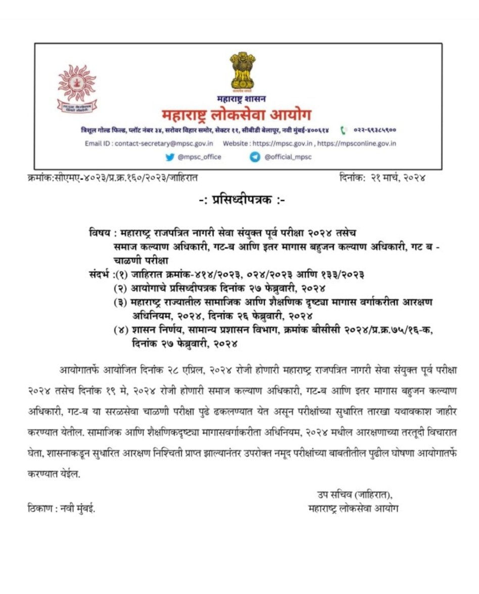 मुंबई :- दि.२१. महाराष्ट्र लोकसेवा आयोगातर्फे २८ एप्रिल, २०२४ रोजी होणारी महाराष्ट्र राजपत्रित नागरी सेवा संयुक्त पूर्व परीक्षा २०२४, १९...