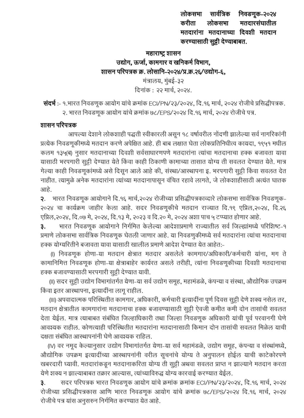 लोकसभा सार्वत्रिक निवडणूक 2024; शासन परिपत्रक जारी रायगड :- दि.२६.राज्यातील लोकसभा मतदारसंघात पाच टप्प्यात मतदान होणार आहे. या लोकसभा निवडणुकीत...